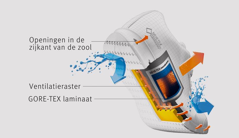 Het ademende vermogen in waterdichte wandelschoenen ondergaat een radicale verandering, doordat vocht nu ook van onder de voet kan worden afgevoerd. Een uitkomst, want maar liefst 30% van het loopvlak van de voet is bezaaid met zweetkliertjes. Deze best ademende GORE-TEX-schoentechnologie* zorgt voor de beste warmteregulering dankzij het extreem goede ademend vermogen. Ook neemt hierdoor het risico op blaren af zonder dat dit ten koste gaat van de waterdichtheid of het wandelcomfort.