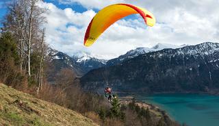 Recht voor me zweeft een enorme roofvogel eindeloos rondjes in de lucht. Greg, mijn piloot, wijst: “Zo te zien is er vandaag genoeg thermiek, nu nog een gunstige startwind.” Ik ben net buiten Interlaken, bij Amisbühl, de startplaats van het paragliden. Dé activiteit waar deze stad om bekend staat. Ingespannen tuurt Greg naar de windvaantjes en de wolken, wachtend op de juiste omstandigheden om te starten. “Rennen!”, roept hij dan ineens. “Rennen tot je geen grond meer onder je voeten voelt.”
