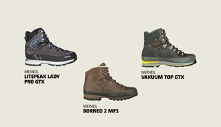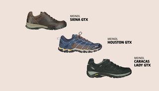 Een voorbeeld van een A-schoen van Meindl is de Houston GTX voor heren, met een bovenwerk van licht en robuust mesh. Deze schoen heeft een zool met Multigrip G4-profiel en bestaat voor 20% uit gerecycled rubber. Dankzij het membraan van Gore-Tex zijn ze ook nog eens waterdicht. Een ander mooi voorbeeld is de Siena GTX, met een bovenwerk van gewaxt, waterafstotend nubuckleer. Ook deze schoenen hebben een waterdicht membraan van Gore-Tex. Deze schoen komt uit de Comfort fit-lijn voor bredere voeten, waarover later meer.