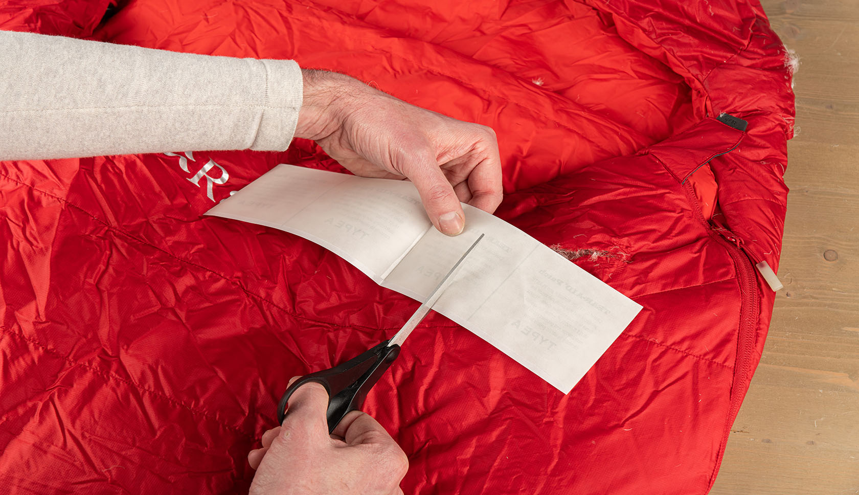 Deze patch is erg plakkerig! Verwijder dus niet de hele beschermfolie voordat je gaat plakken. De patch zal dan aan zichzelf, aan jou of aan iets anders blijven plakken. Verwijder in plaats daarvan de beschermfolie geleidelijk, nadat je eerst een klein stukje op de slaapzak hebt geplakt. Je rolt als het ware de patch af over de scheur.