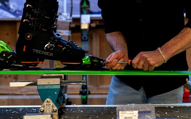 • Monteren van skibindingen zonder railsysteem inclusief boren en afstellen: heb je ski's zonder rails? Dan monteren we de skibindingen door in de ski's te boren. We doen dit door de ski op de juiste plek voor te boren met de correcte bindingmal, waarna we de binding op de ski schroeven.